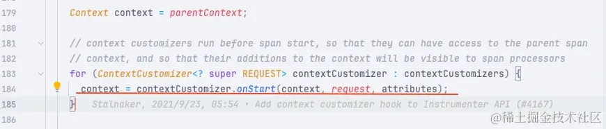 可以看到 spanProcessor.onStart 这个函数会在 contextCustomizer 之后调用。