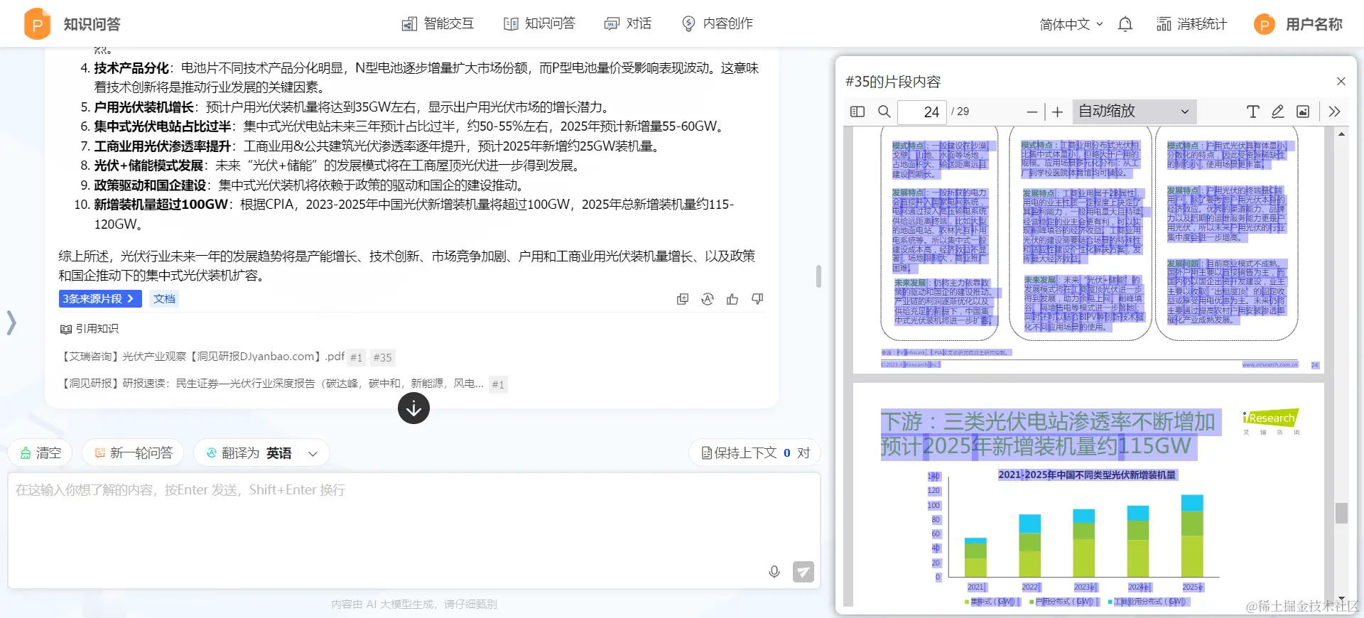 - 答案溯源: 在缺乏片段溯源的知识问答中,用户若想核实具体答案,通常需手动翻阅整篇文档,耗时耗力。汉得知识问答应用支持答案的片段溯源功能,能直观展示答案的原始来源片段 ,并精准定位其在原文档中的位置, 极大地提升了用户的查询效率。