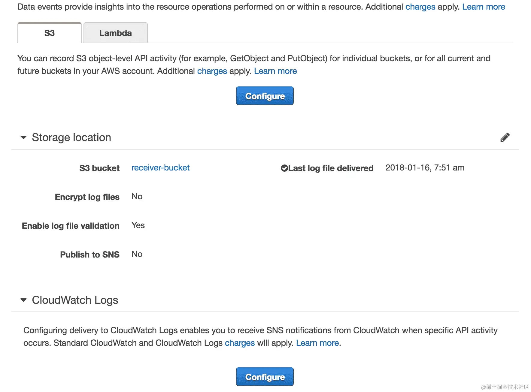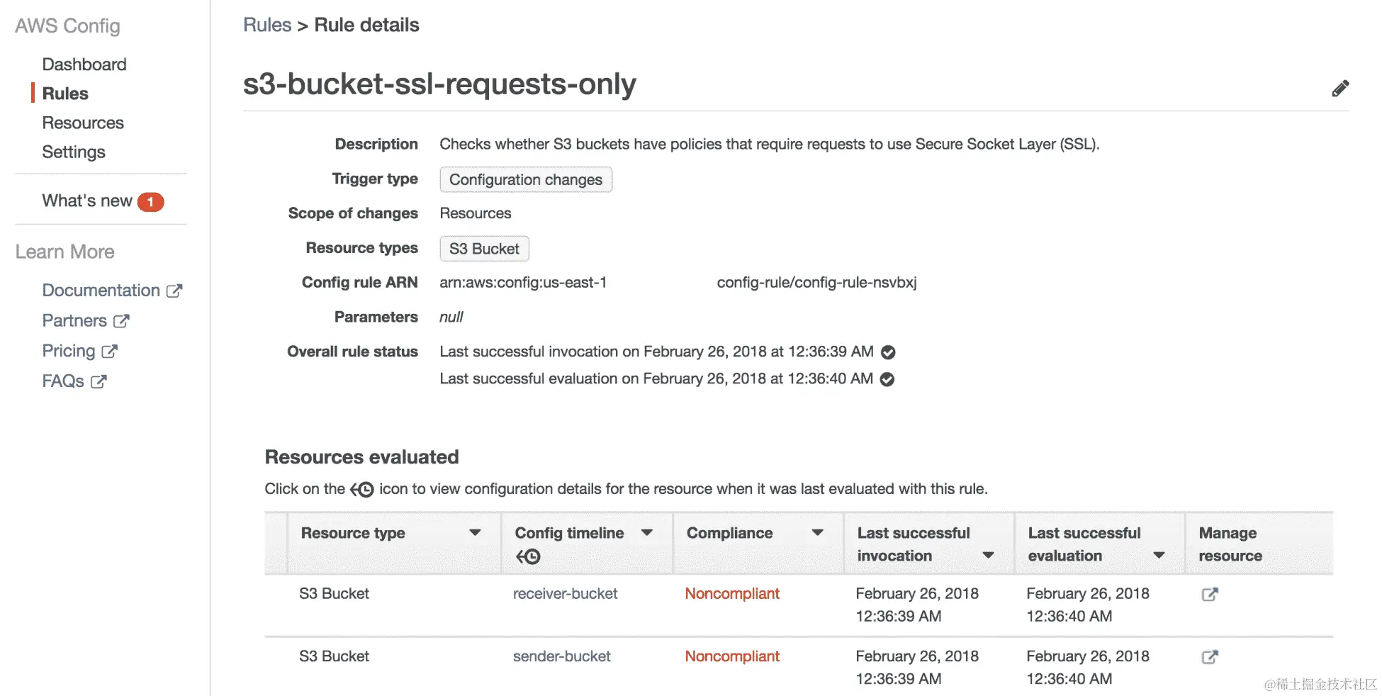这意味着我们有两个 AWS S3 存储桶,这些存储桶没有通过存储桶策略打开 SSL 请求。单击“规则”链接后,您可以看到更多详细信息,包括存储桶名称,以及记录这些配置更改的时间戳:
