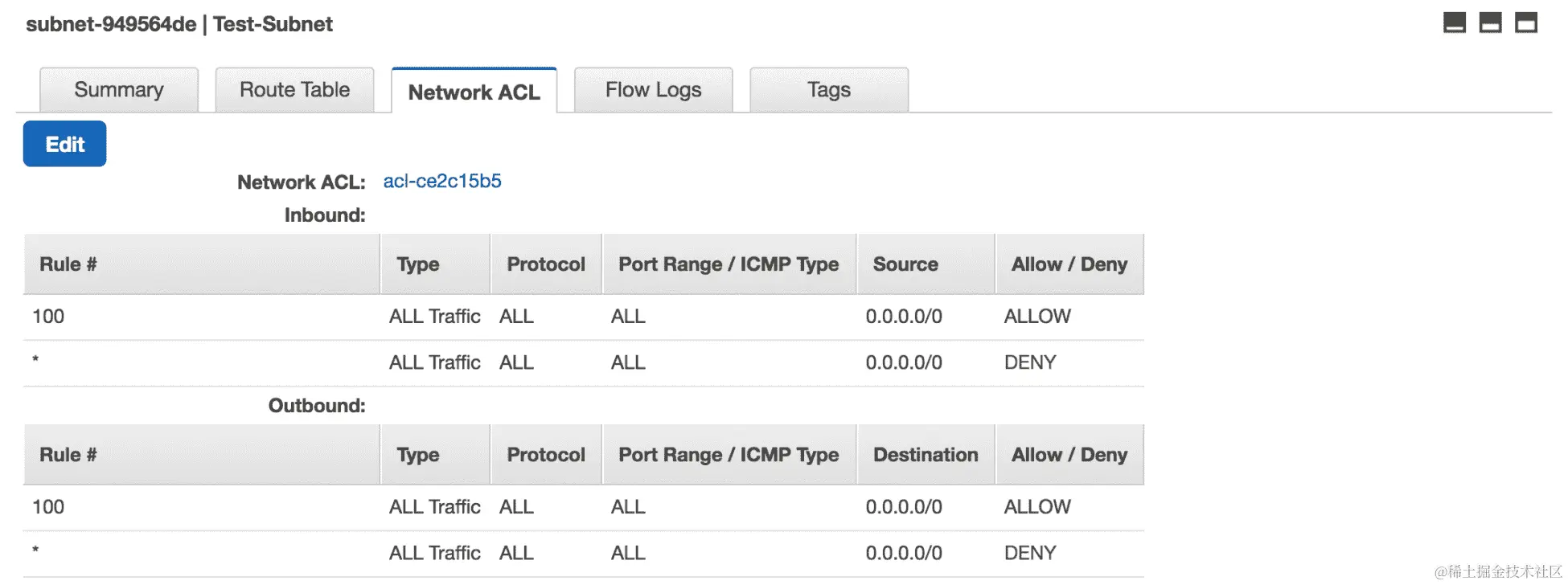 - 在“网络 ACL”选项卡中,您可以看到为我们的子网分配的网络规则。在这里,我们可以看到子网对所有流量(0.0.0.0/0)都是开放的。因此,为了使我们的子网变为私有,我们需要修复这个问题: