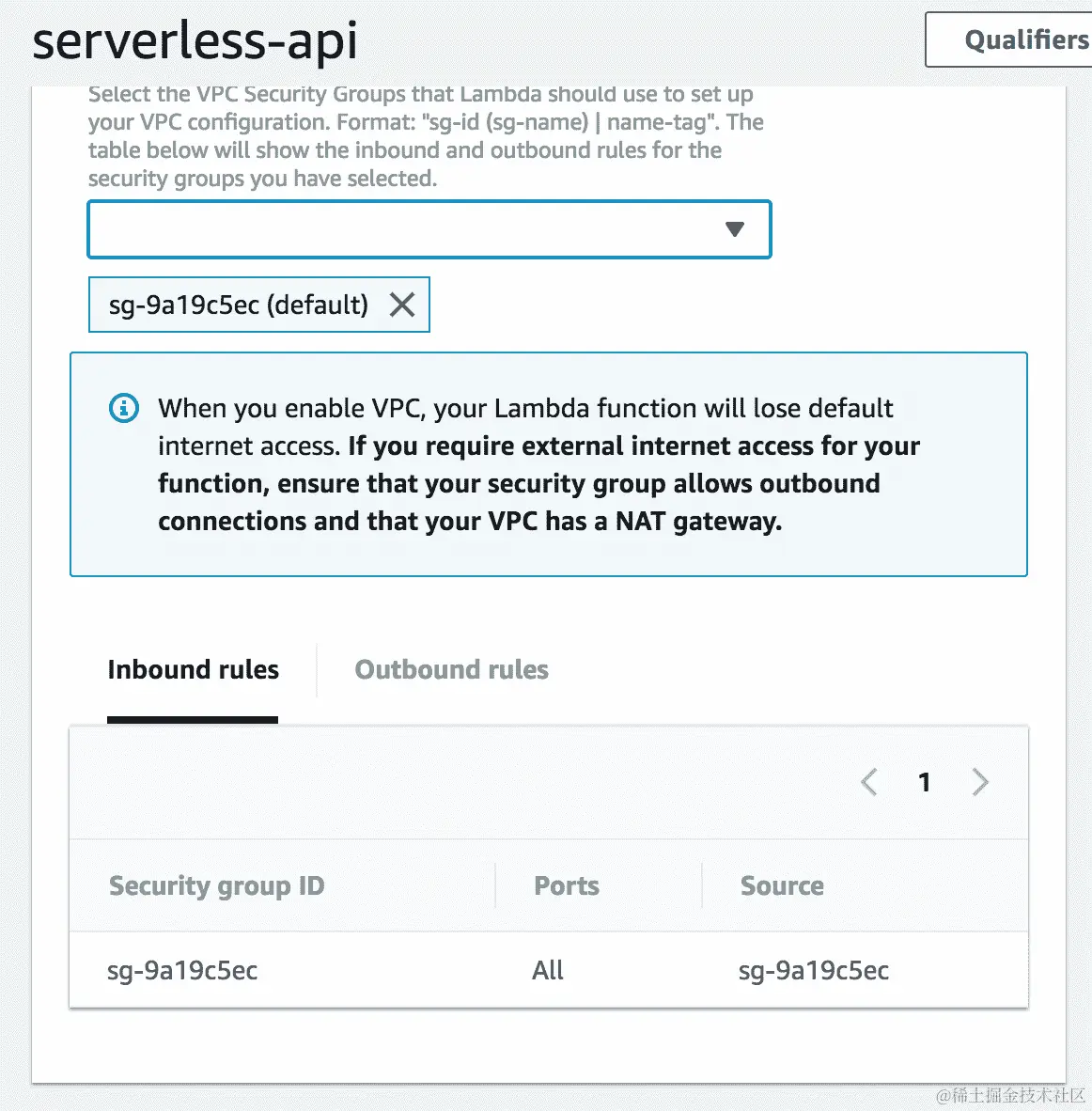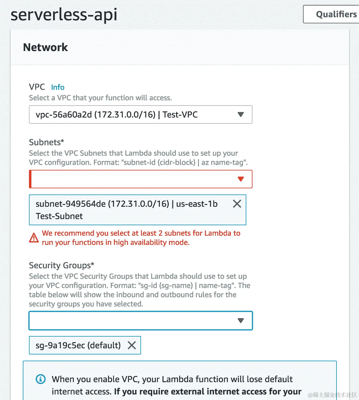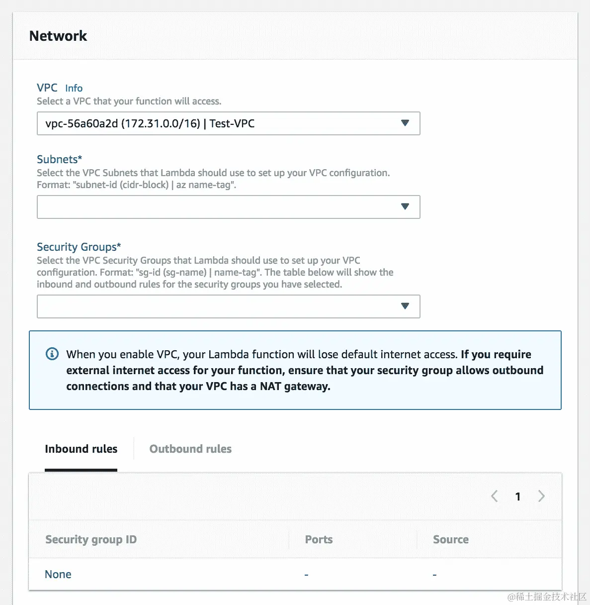 - 选择 VPC 后,它将进一步要求您输入有关子网、安全组等的详细信息,如下面的屏幕截图所示。我们将在接下来的部分中了解它们,因此,我们稍后将为 Lambda 函数配置 VPC: