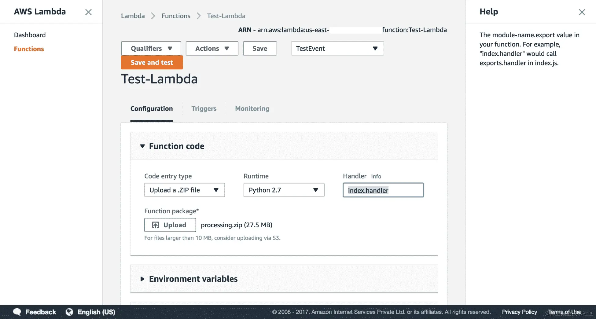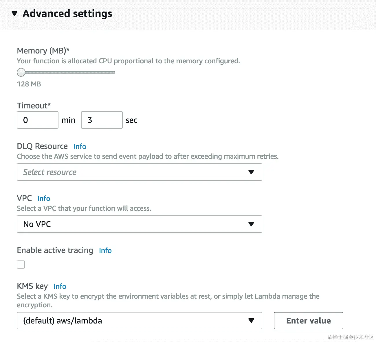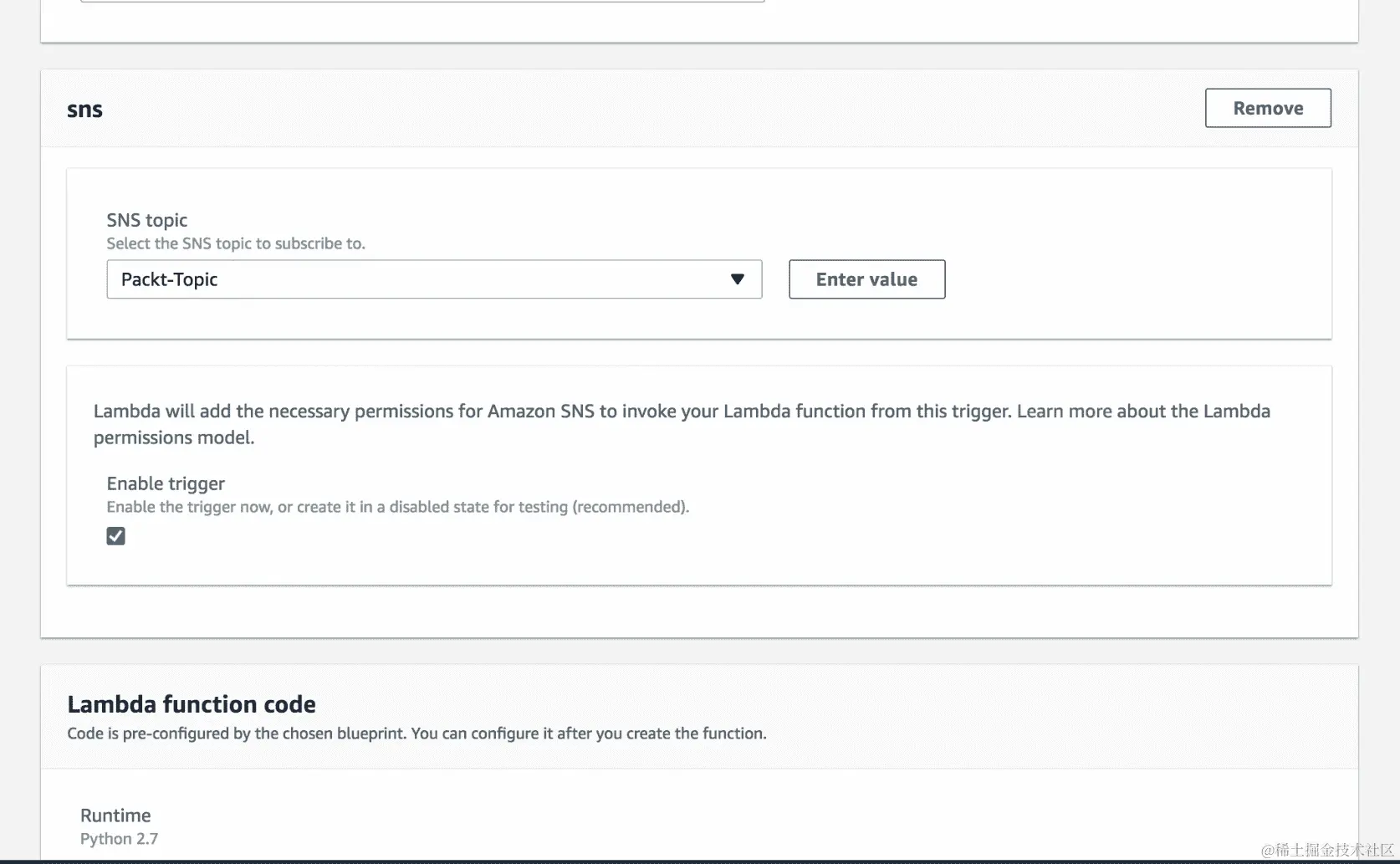 - 选择 VPC 后,它将进一步要求您输入有关子网、安全组等的详细信息,如下面的屏幕截图所示。我们将在接下来的部分中了解它们,因此,我们稍后将为 Lambda 函数配置 VPC: