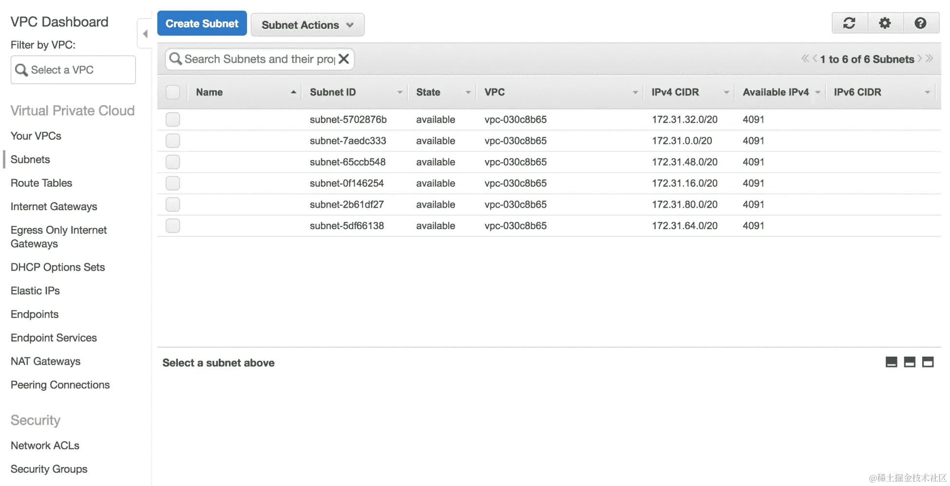 - 这将带您进入子网控制台,在那里您将看到一些已经存在的子网。这些是您所在区域每个可用区的默认子网: