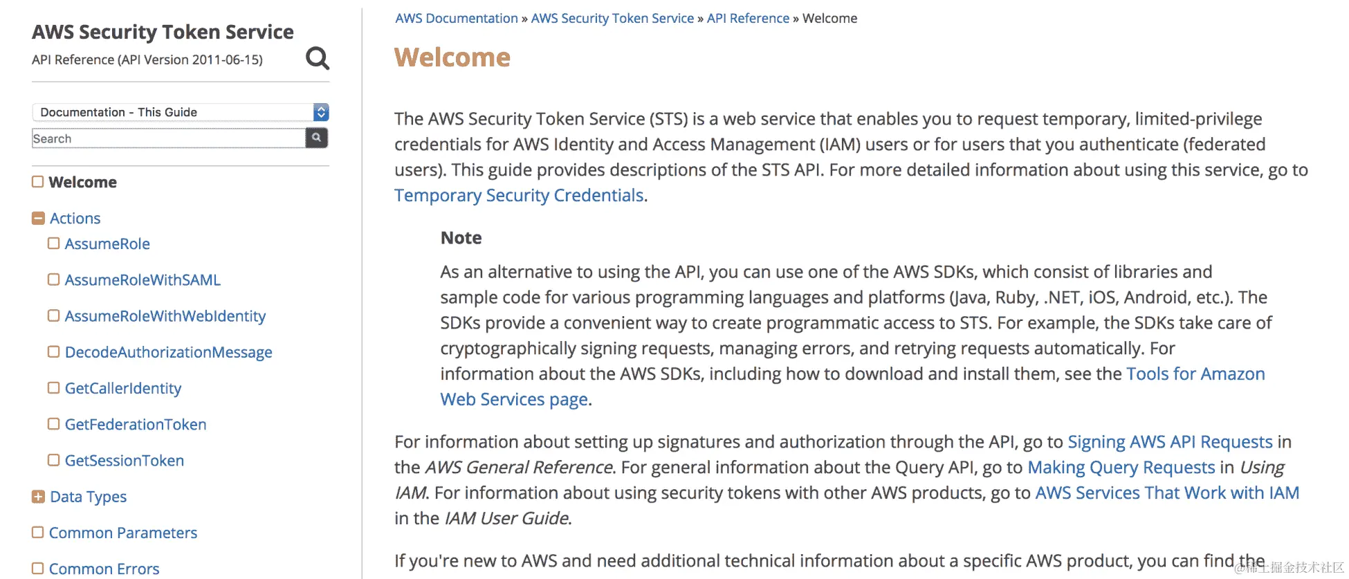 您可以查看 STS 的文档:docs.aws.amazon.com/STS/latest/APIReference/Welcome.html。