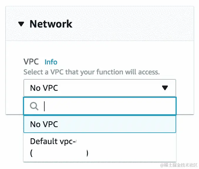 - 从下拉列表中,您可以选择要托管 Lambda 函数的 VPC: