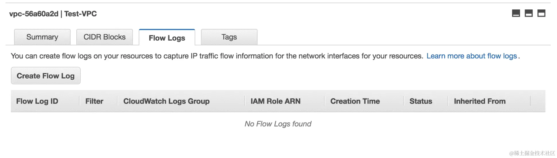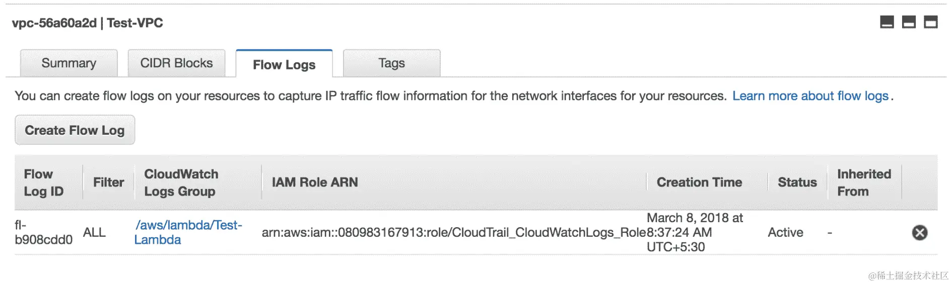 - 创建后,您可以在“流日志”选项卡下看到新创建的 VPC 流日志,如下所示: