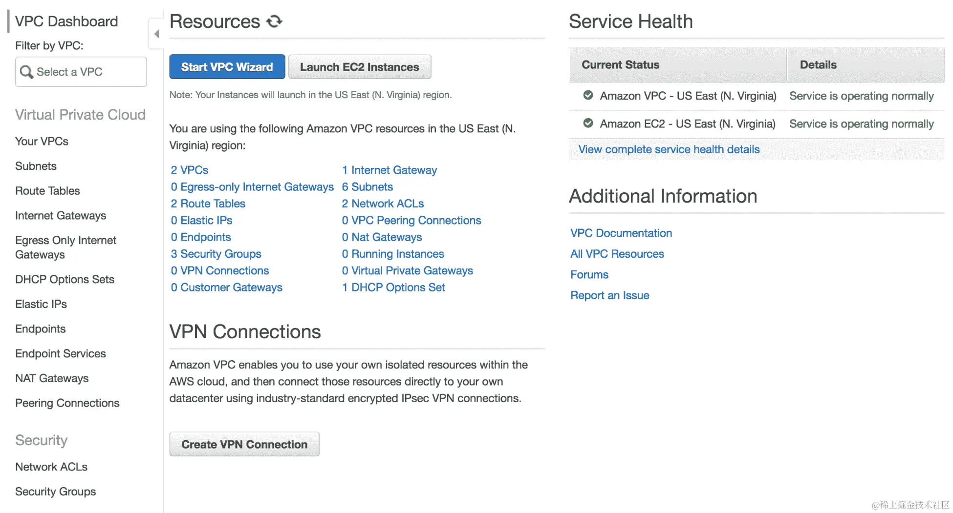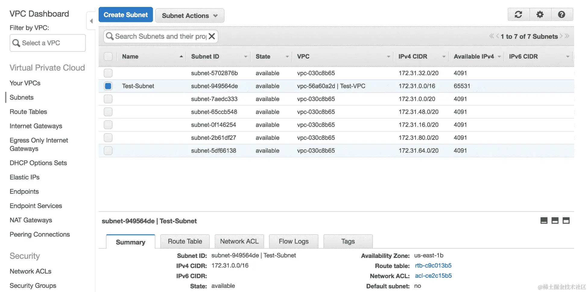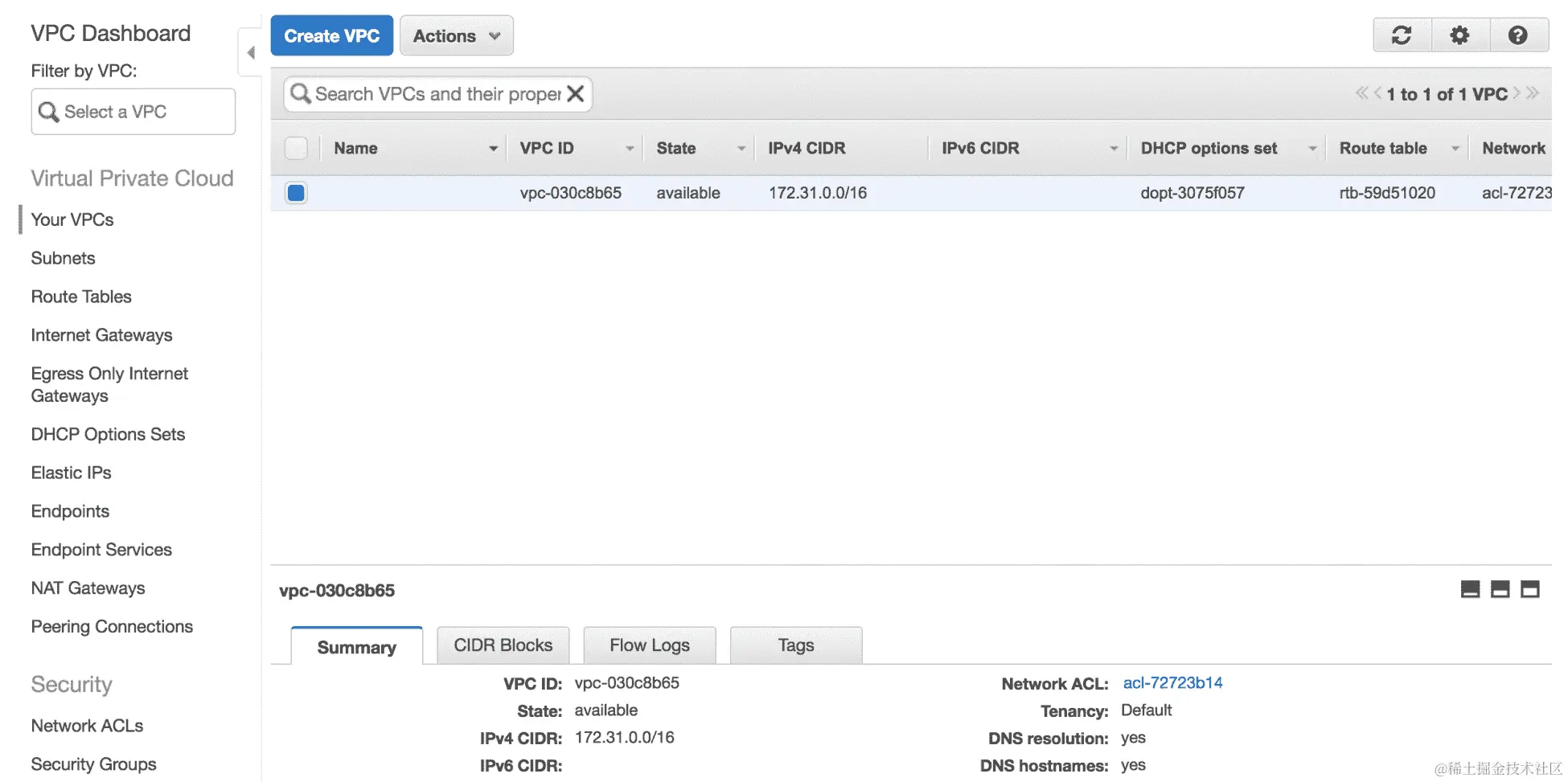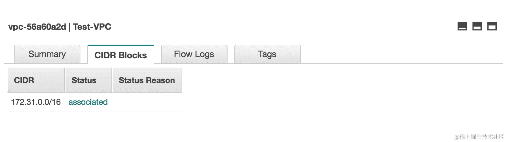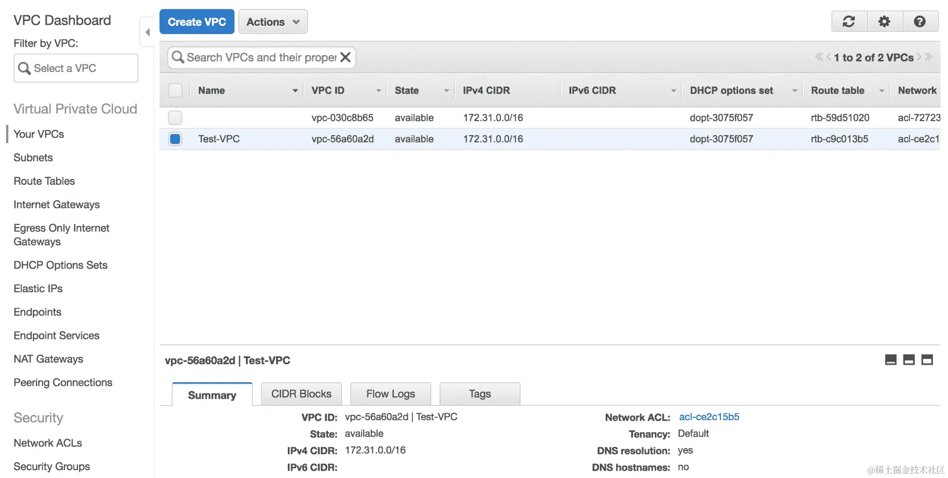 Test-VPC名称的 VPC。我们可以在仪表板上看到所有相应的元设置:
