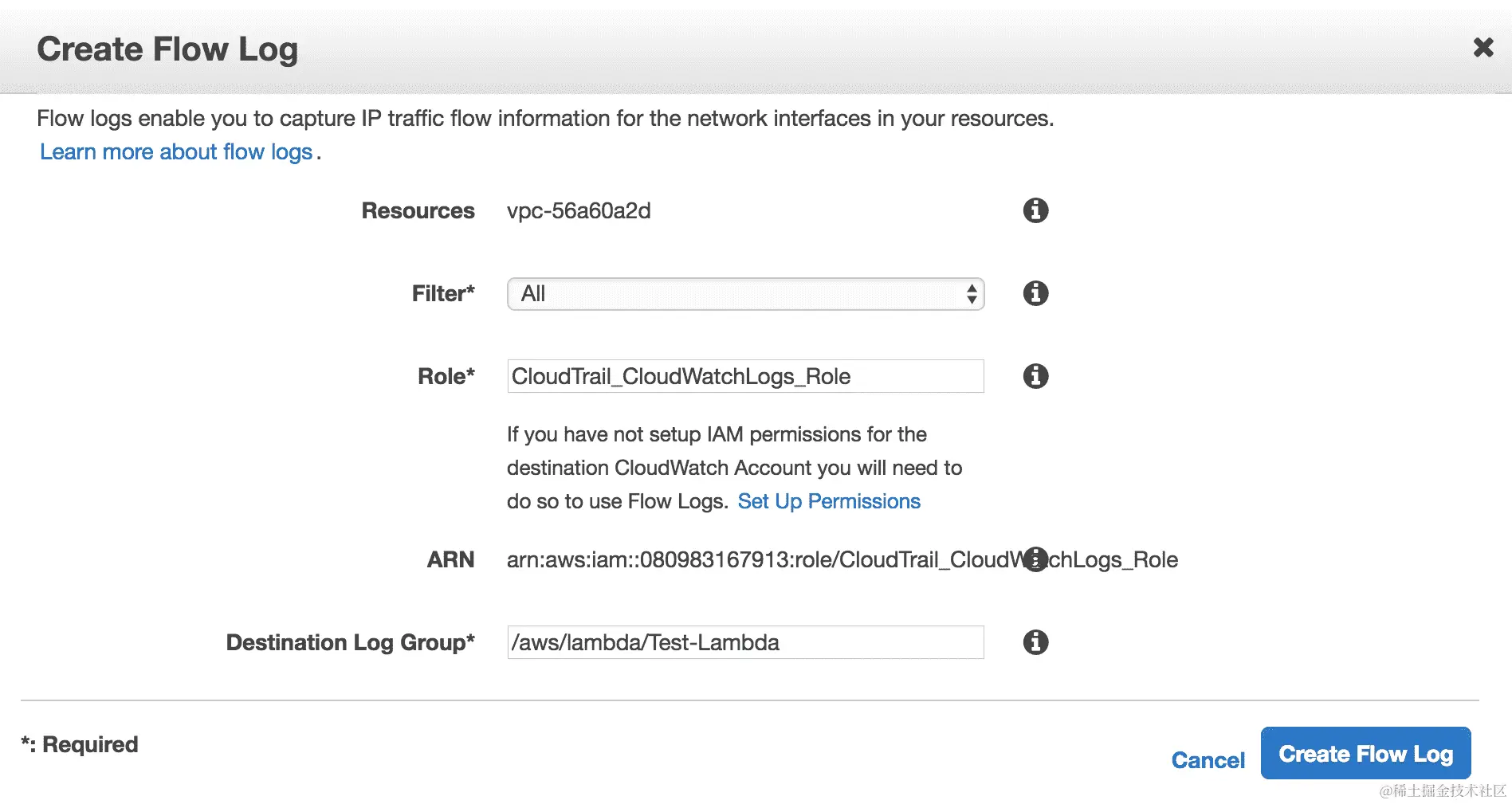 - 一旦输入了所有细节,您可以继续并点击底部的“创建流日志”选项,这将使用所需的设置创建 VPC 流日志: