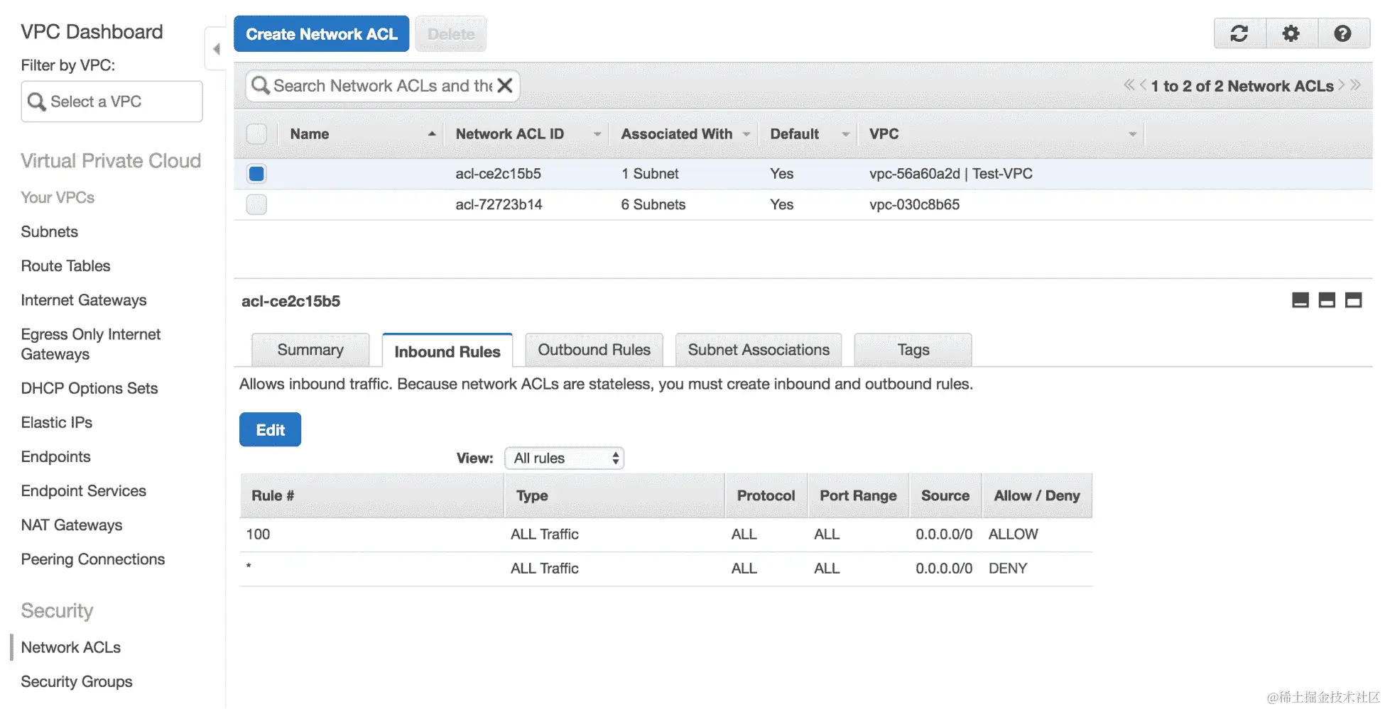 - 通过单击控制台左侧的链接,转到网络 ACLs 控制台。您将进入以下页面: