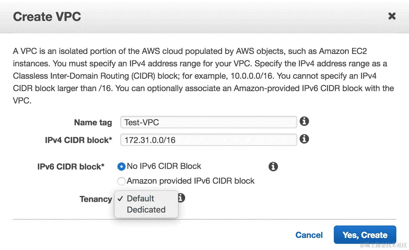 - 名称标签框需要有 VPC 的名称。IPv4 CIDR 块是您为无类域间路由输入 IP 范围的地方。然后,您可以选择是否要 IPv6 CIDR 块。您还可以选择租户设置;这定义了您的 EC2 实例在 VPC 内的运行方式,以及相应的资源共享: