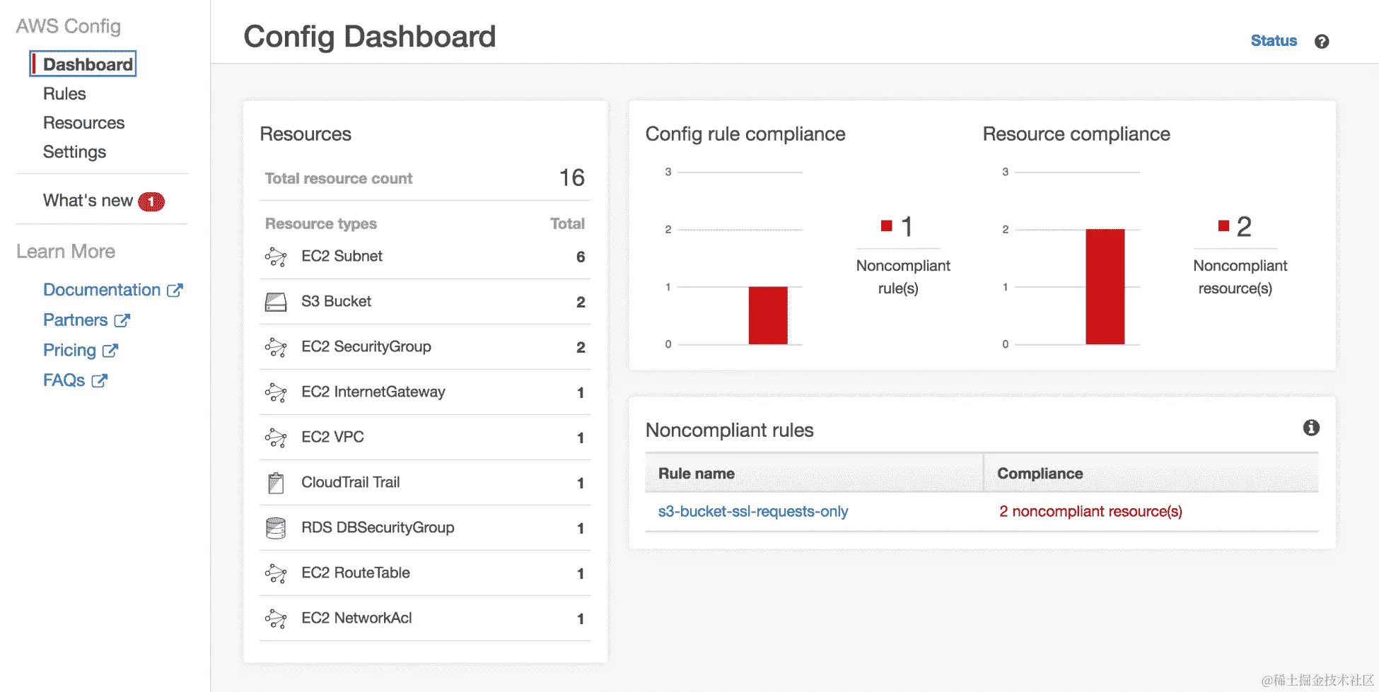 - 您可以看到仪表板显示了 2 个不符合规定的资源,这意味着我的两个 AWS 资源不符合我在配置中设置的规则。让我们看看这些规则: