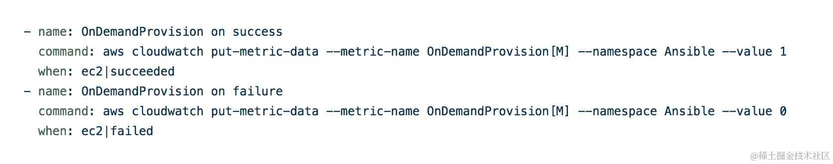 监控类似于日志记录。监控这些系统也大多是一个未解决的问题。由于服务器在工作负载运行后全部终止,我们无法从服务器中轮询历史日志,并且延迟也不会被容忍,或者更准确地说,不可能。通过在每个任务后执行一个任务,根据前一个任务是否成功执行发送自定义指标到 CloudWatch 来监视 Ansible 的每个任务。这将看起来像这样: