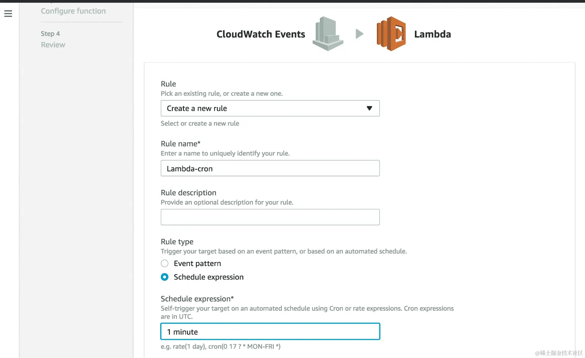 首先,让我们了解触发器中的cron 功能的概念。云上的无服务器系统具有设置监控的能力,这使得触发器可以每隔几分钟或几小时触发一次,并且可以设置为普通的 cron 作业。这有助于将无服务器的概念作为常规的 cron 批处理作业。在 AWS 环境中,可以通过 AWS CloudWatch 设置 Lambda 作为 cron 触发器,通过手动输入时间间隔来设置 cron 的频率,并且还可以按照 cron 格式输入间隔: