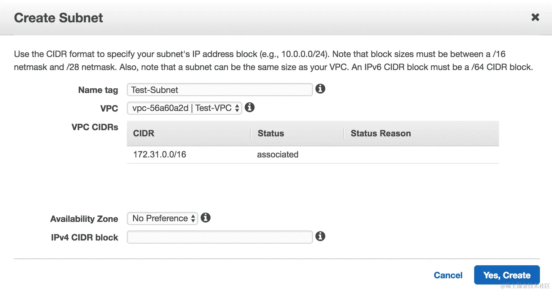 - 现在,要创建新的子网,您需要单击控制台左上角的蓝色“创建子网”按钮。在创建向导中,您将被要求输入以下详细信息-子网的名称、要放置的 VPC、可用区以及首选的 IPv4 CIDR 块。我已将此子网放在了我们在上一节中创建的 VPC 中:
