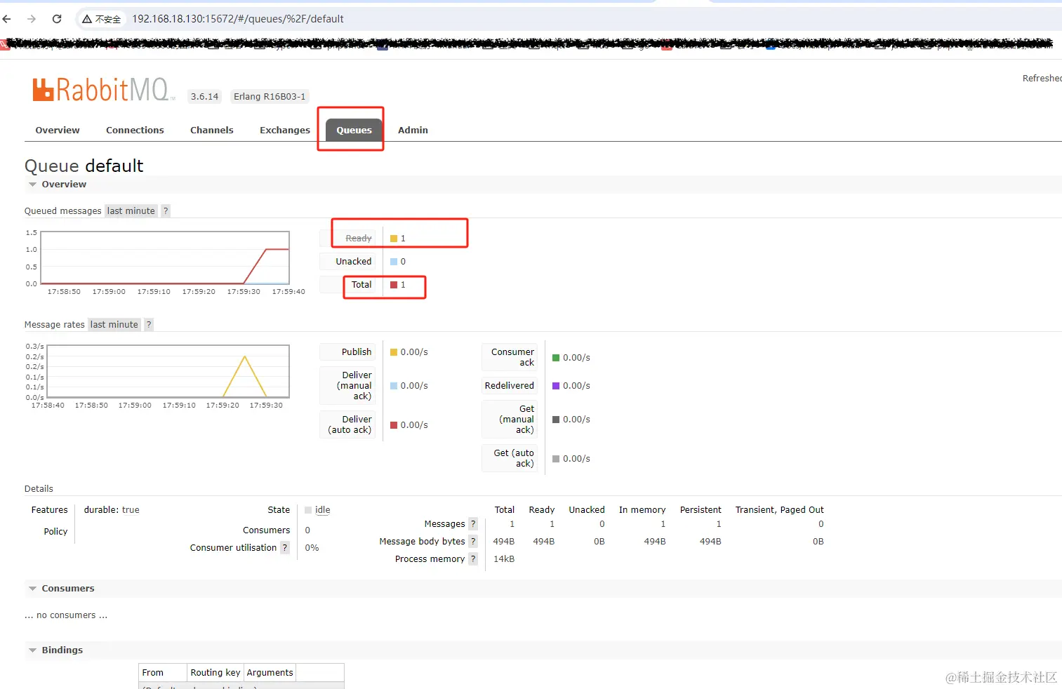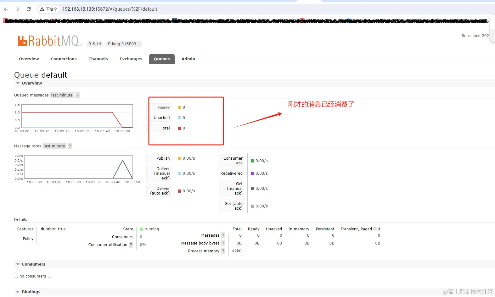 connections:无论生产者还是消费者,都需要与RabbitMQ建立连接后才可以完成消息的生产和消费,在这里可以查看连接情况 -