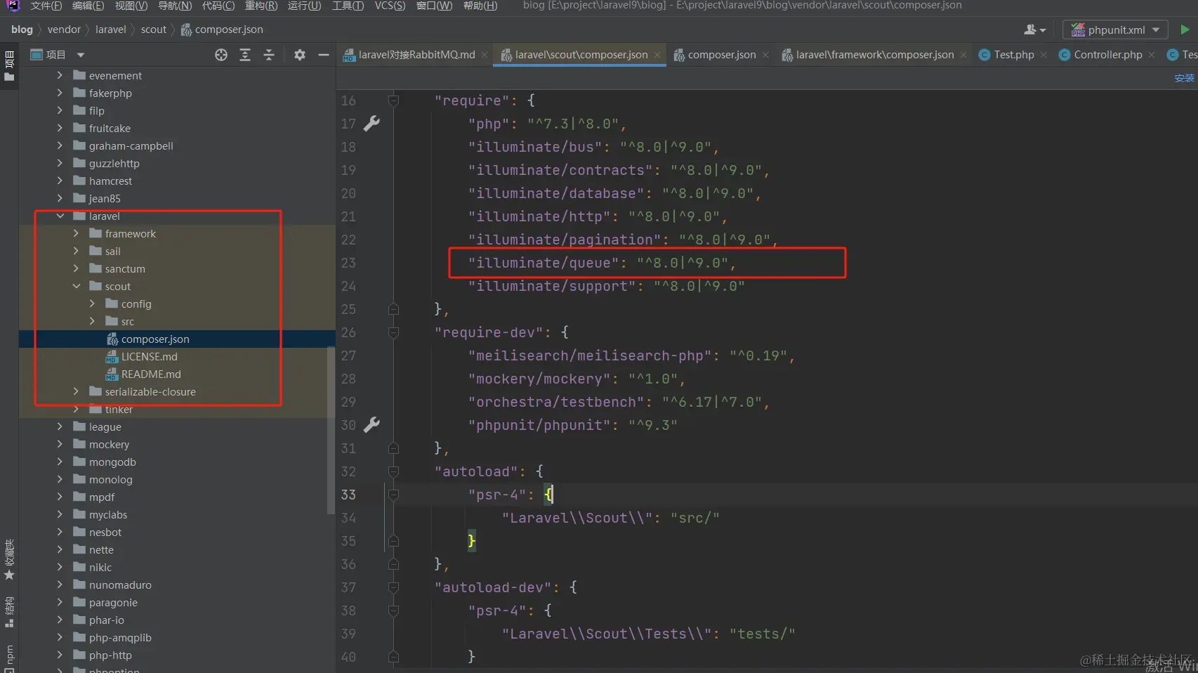laravel 自带 illuminate/queue 版本查看:vendor->laravel->scout->composer.json