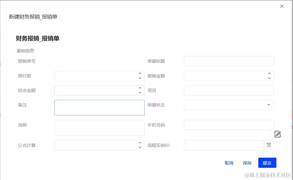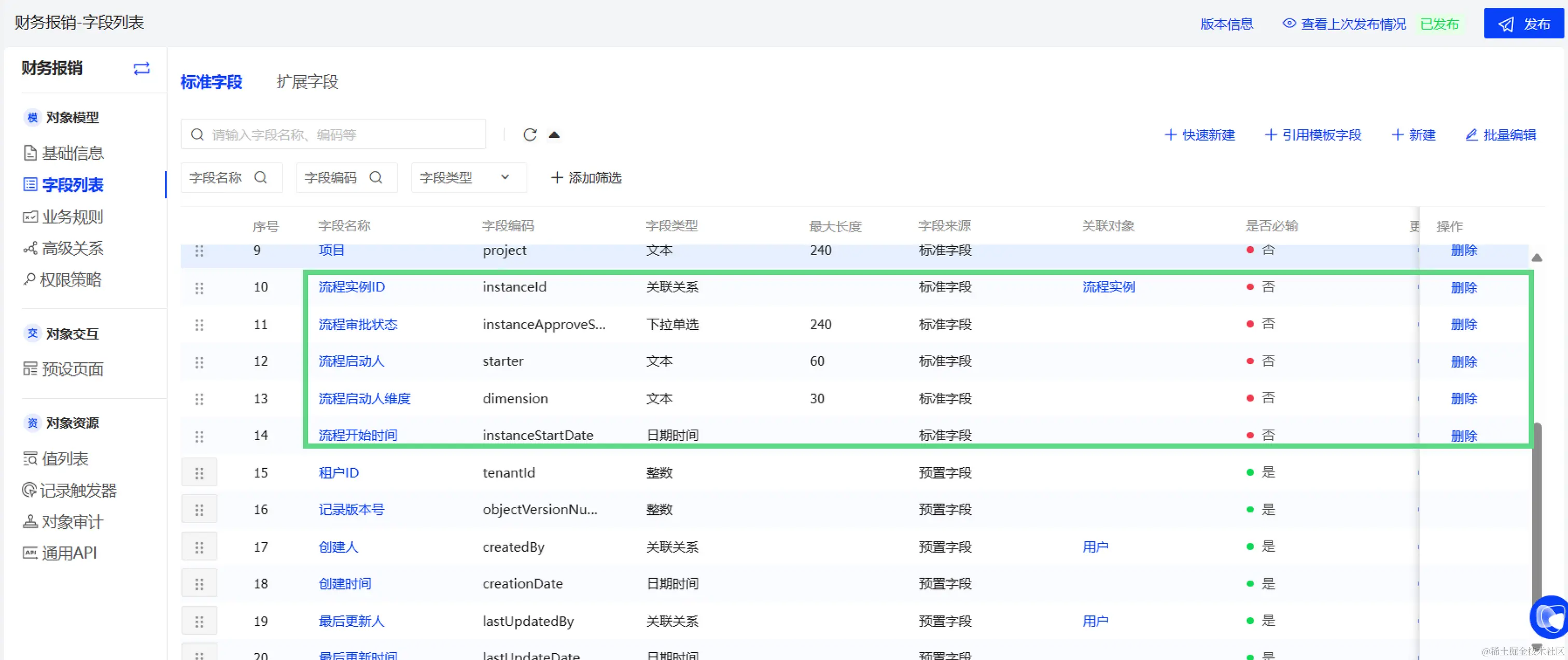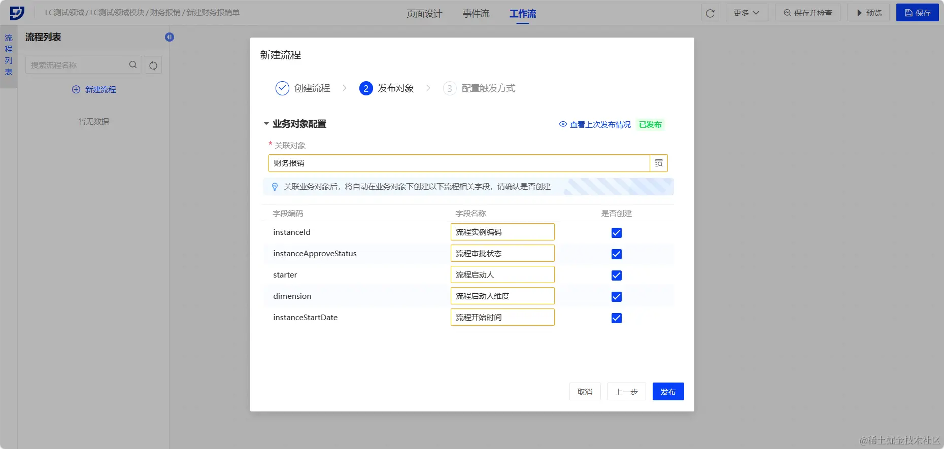 切换到财务报销业务对象,可看到流程字段已创建完成且业务对象发布成功。