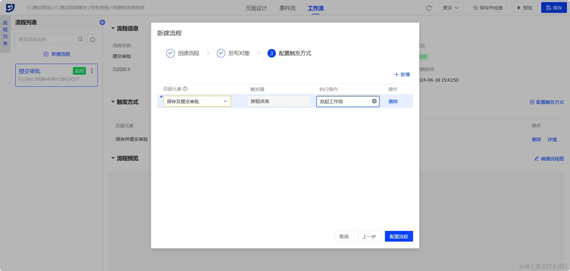 选择页面元素(只支持未绑定事件流的按钮)、触发器(默认按钮点击)、执行操作(发起工作流/撤回工作流)。此步操作将实现点击按钮触发 <发起 / 撤回工作流> 。