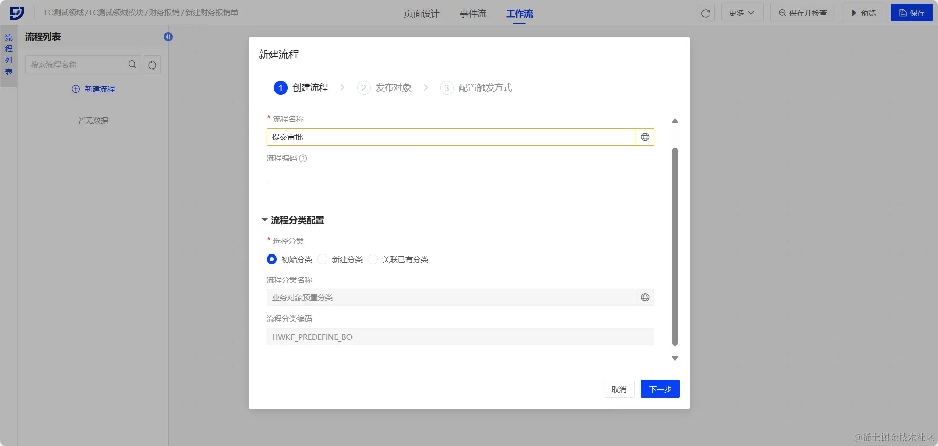 切换到工作流标签页,点击 【创建流程】 按钮,在新建流程弹窗-创建流程步骤中输入流程基本信息,并选择流程分类。
