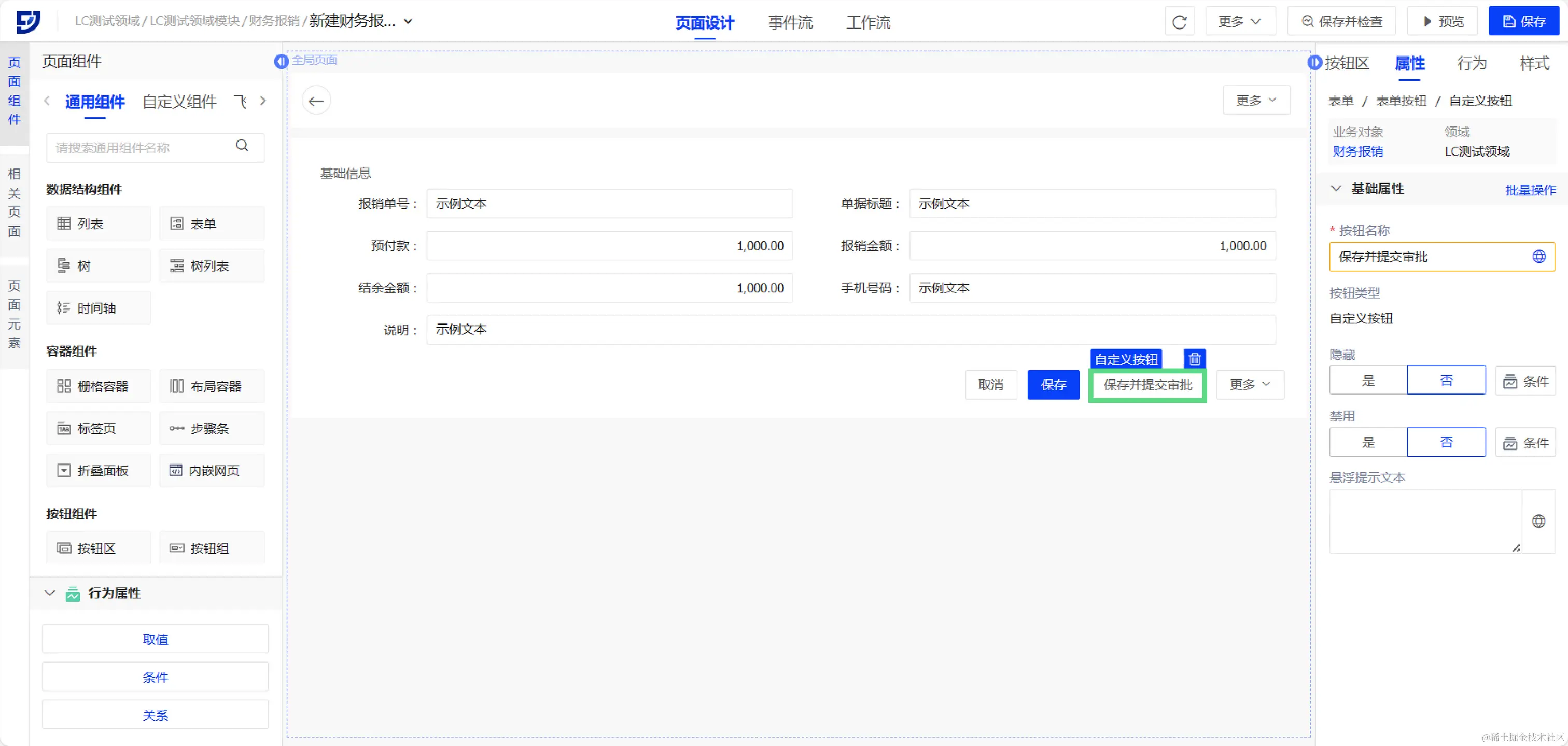 财务报销单-表单按钮区新建 【自定义按钮】 ,修改名称为“保存并提交审批”,保存页面。