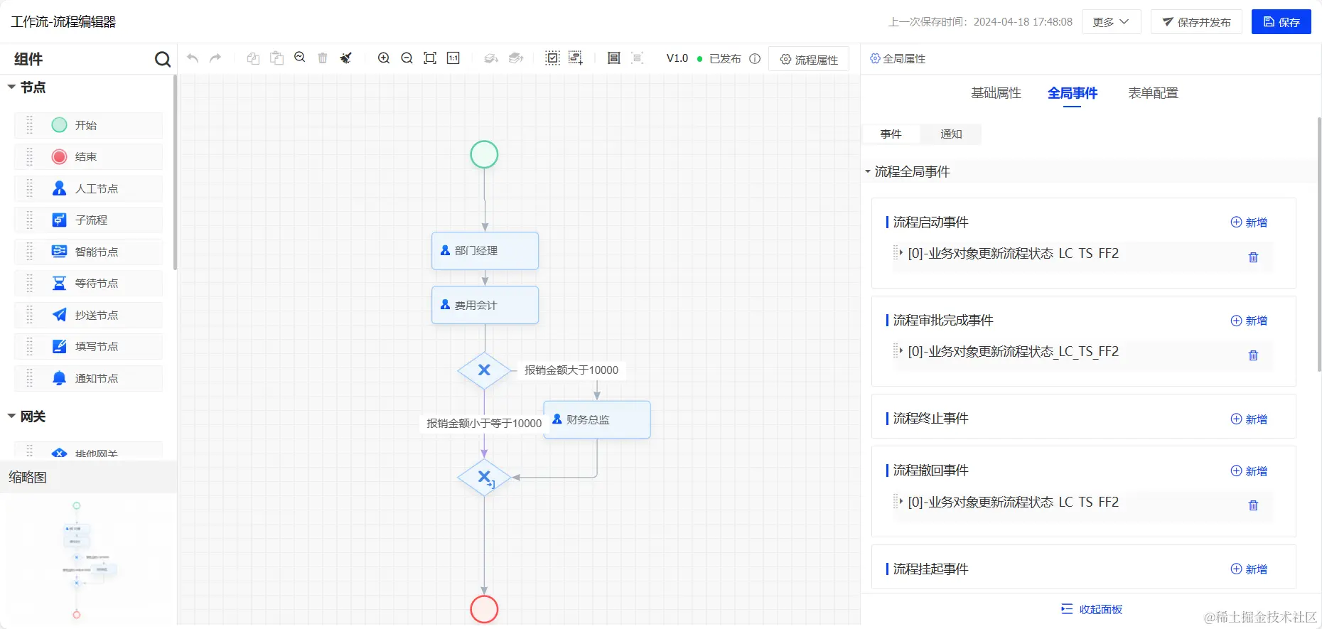 点击 【配置流程】 按钮,页面跳转到流程编辑器页面;进入流程编辑器页面,拖拽节点,设置节点审批人,并通过网关配置条件;点击 【保存并发布】 流程,流程发布成功。