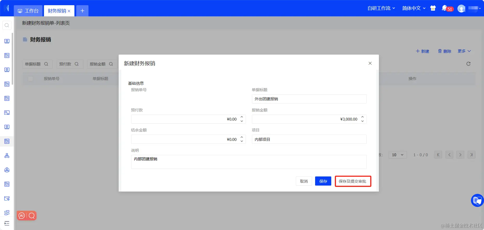 1. 新建财务报销单,输入基础数据,点击 【保存并提交审批】 按钮,保存数据并提交审批。