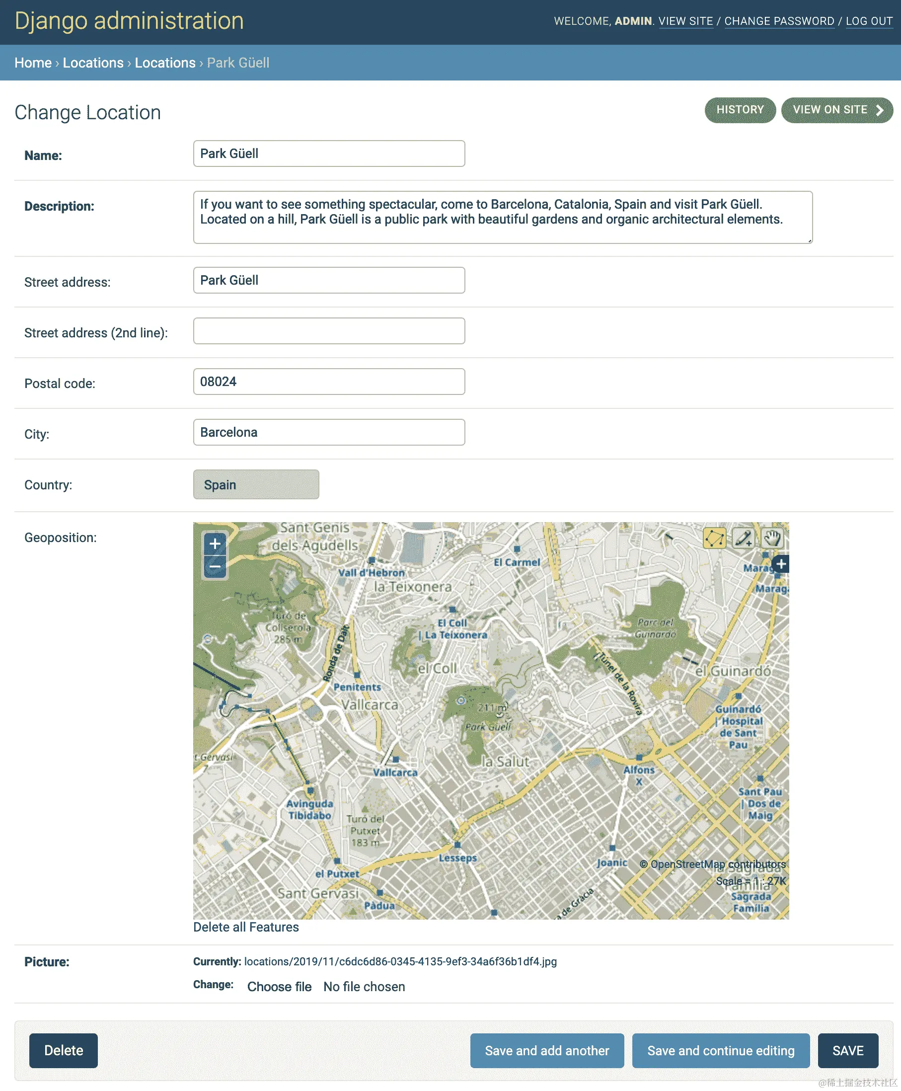 管理使用自定义的LocationModelForm,其中排除了geoposition字段,添加了Latitude和Longitude字段,并处理它们的值的保存和加载。