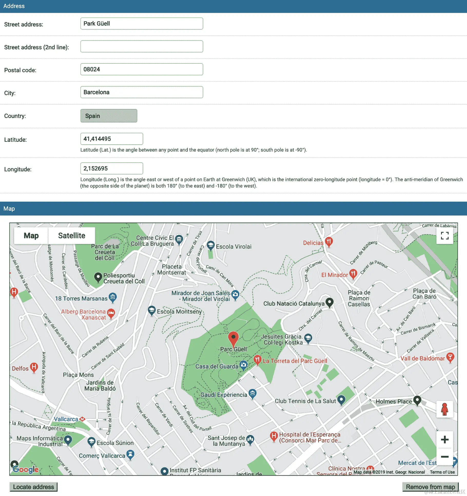 当您点击其中一个选择时,地图上会出现标记,显示位置的确切地理位置。纬度和经度字段将填写如下: