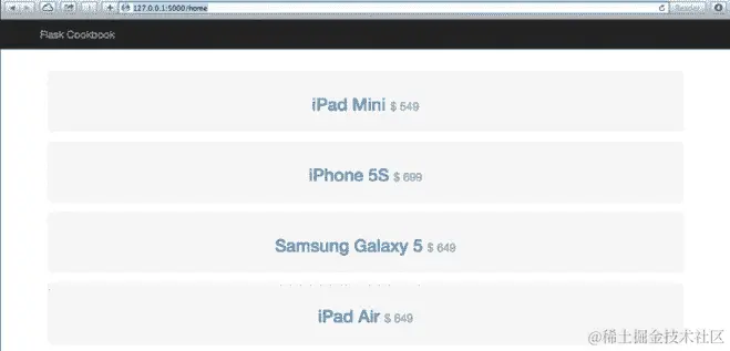 输入一个 URL 进行商品的搜索,比如http://127.0.0.1:5000/product-search?name=iPhone。这将搜索名称为 iPhone 的商品,然后在 pruducts.html 模板上列出搜索结果。相似的,当需要的时候我们可以搜索 price 或者 company,或者 category。为了更好的理解,你可以尝试各种各样的组合。