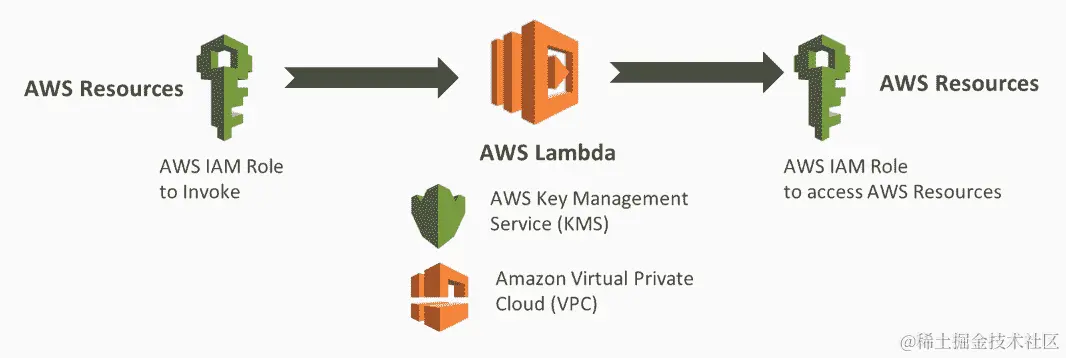 此外,密钥管理服务(KMS)是 AWS 管理的密钥服务,允许您对数据进行加密和解密,例如在数据库或 NoSQL 数据存储中的数据。亚马逊虚拟私有云是另一个选项,Lambda 默认在安全的 VPC 中运行。但是,如果您需要访问资源,例如弹性碰撞集群或 RDS,这些资源位于私有 VPC 中,您可能希望在自己的私有 AWS VPC 中运行它。以下是使用 AWS Lambda 使用 AWS KMS 和 AWS VPC 的工作流表示: