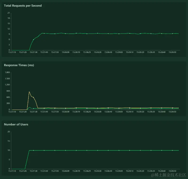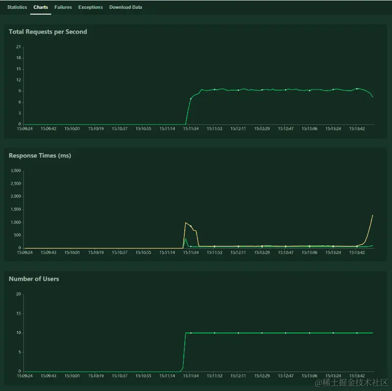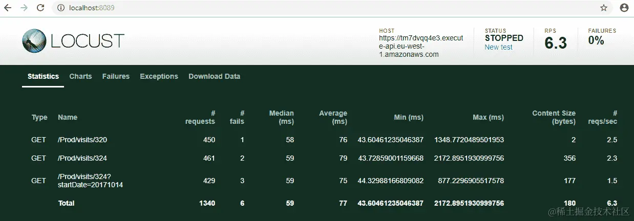 使用 10 的孵化速率和 100 个用户,我们得到以下结果: