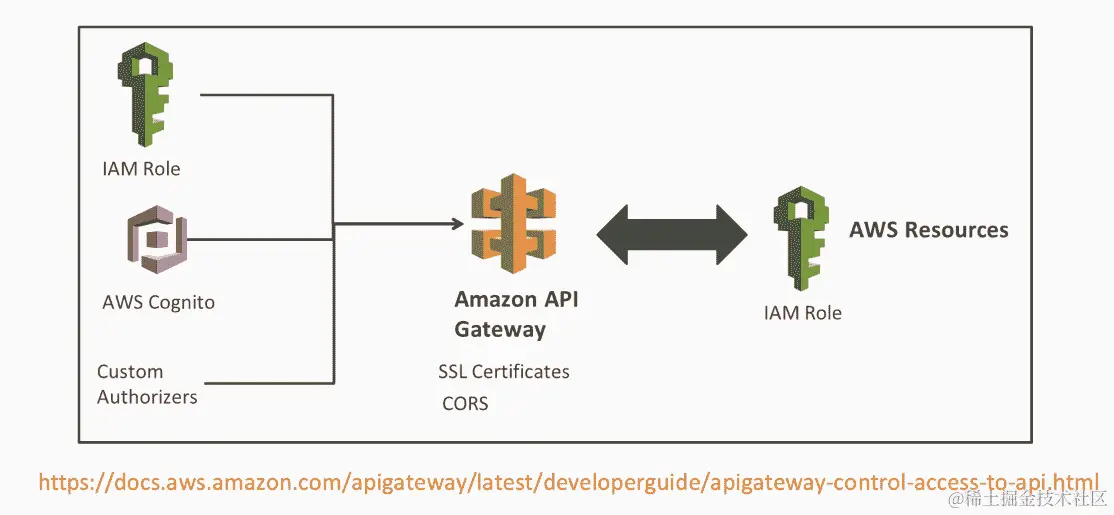 对于 API 网关安全性,有三种方式可以控制谁可以调用您的 API 方法。这被称为请求授权,如下图所示: