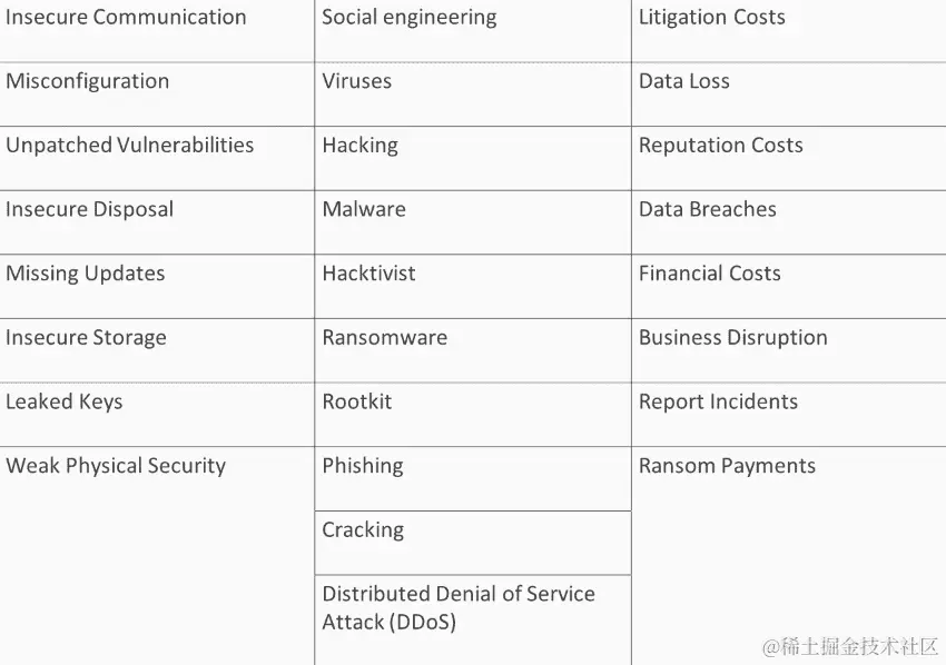 在左侧,我们有各种配置不正确、缺少更新或未加密通信手段的系统。这实际上可能导致中间部分,例如系统被黑客入侵、勒索软件要求或对您的系统进行渗透。例如,可能会发动分布式拒绝服务攻击,这将使您的电子商务网站无法访问。