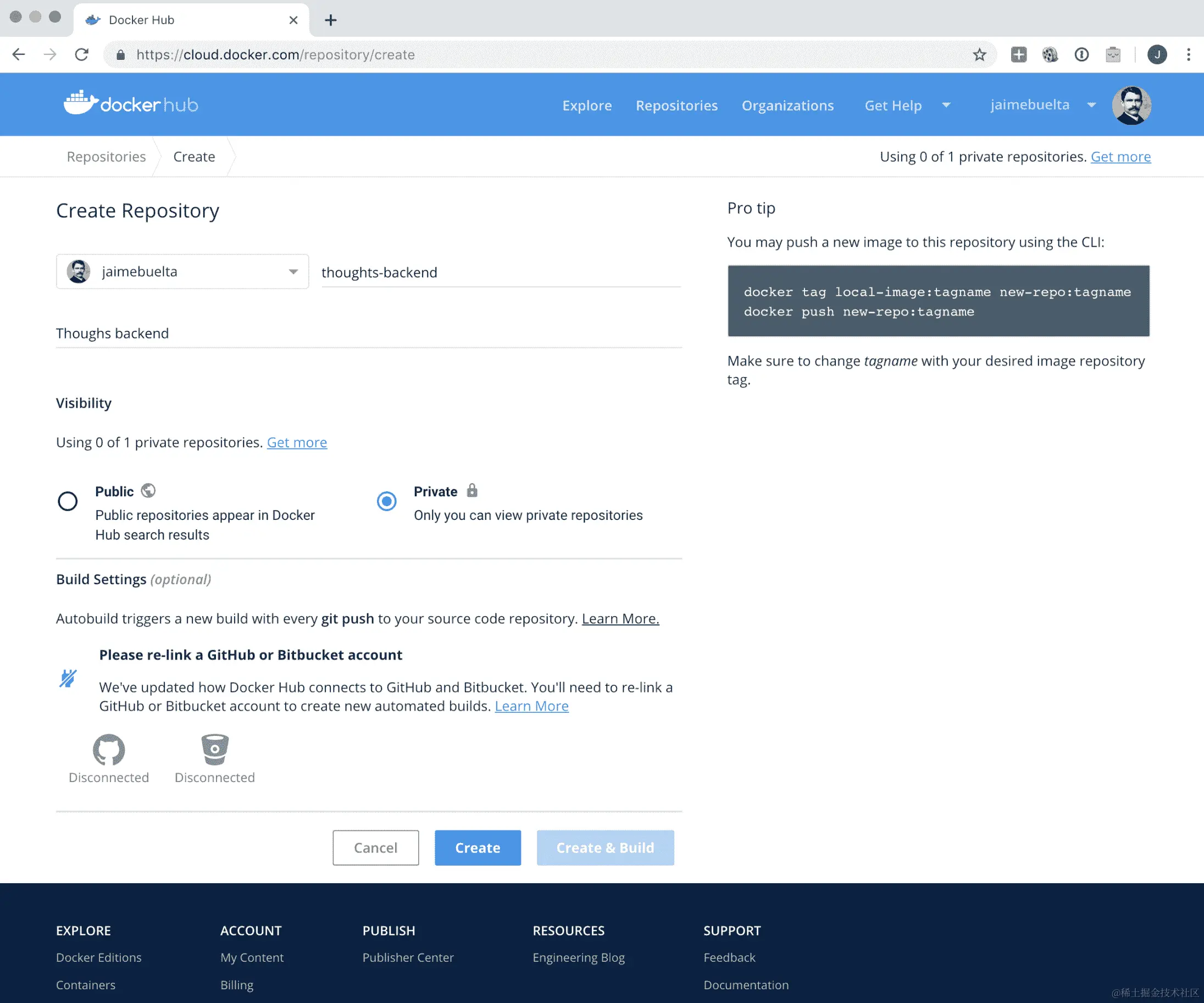 我们将在 Docker Hub 注册表中创建一个新的仓库。您可以免费创建一个私有仓库,以及任意数量的公共仓库。您需要创建一个新用户,这可能是在下载 Docker 时的情况。