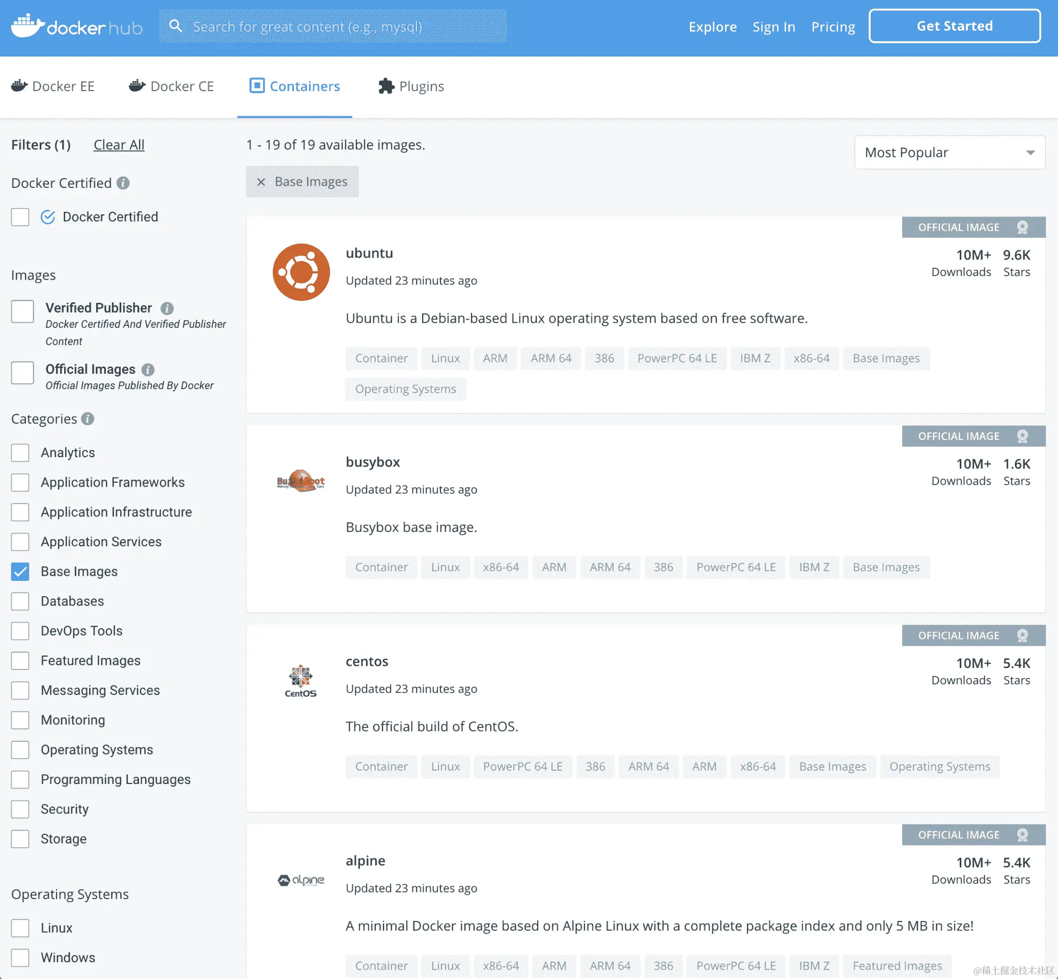 默认注册表是 Docker Hub。这是默认配置的,它作为公共镜像的主要来源。您可以在hub.docker.com/上自由访问它,并搜索可用的镜像来基于您的镜像:
