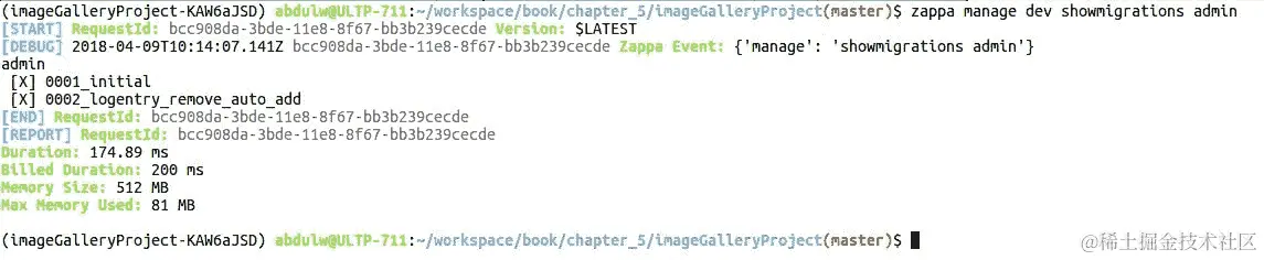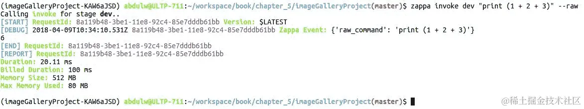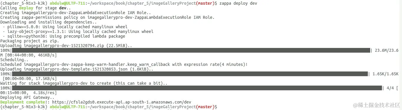 在这里,我使用zappa update dev来部署我的现有应用程序。此命令将在最后打印部署的 URL;我们可以使用它在生产环境中测试应用程序。