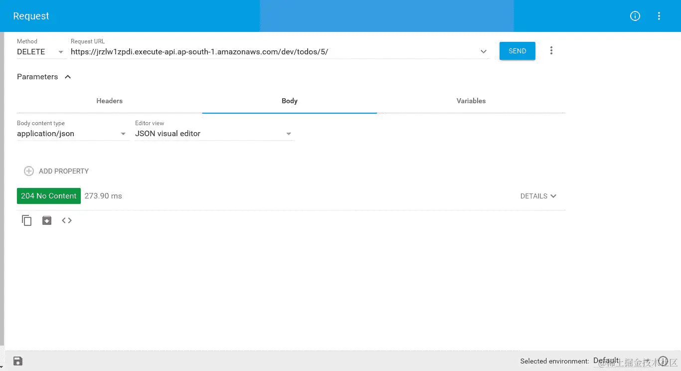 DELETE:通过 URL 中的记录特定 ID 的帮助删除整个记录集,并返回带有 204 状态代码的响应