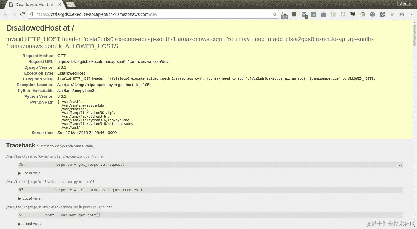 由于我们使用 Zappa 在 AWS Lambda 上部署了应用程序,Zappa 配置了具有代理到 AWS Lambda 的 API Gateway。因此,它将具有在前一节中提到的随机生成的 API Gateway 链接。