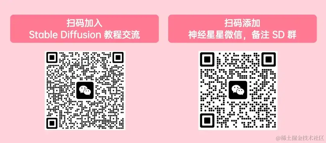 我们还建立了 Stable Diffusion 教程交流群,欢迎小伙伴们入群探讨各类技术问题、分享应用效果~