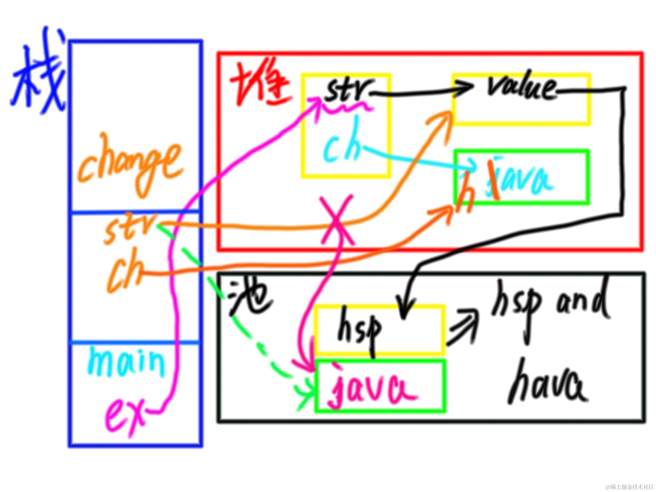 方式二:调用构造器String s2 = new String("hsp"); //s2指向堆中对象