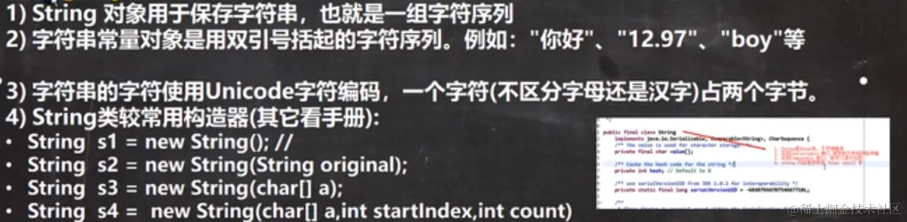 - String保存的是字符串常量, 里面的值不能更改,每次String类的更新实际 上就是更改地址,效率较低//private final char value[];