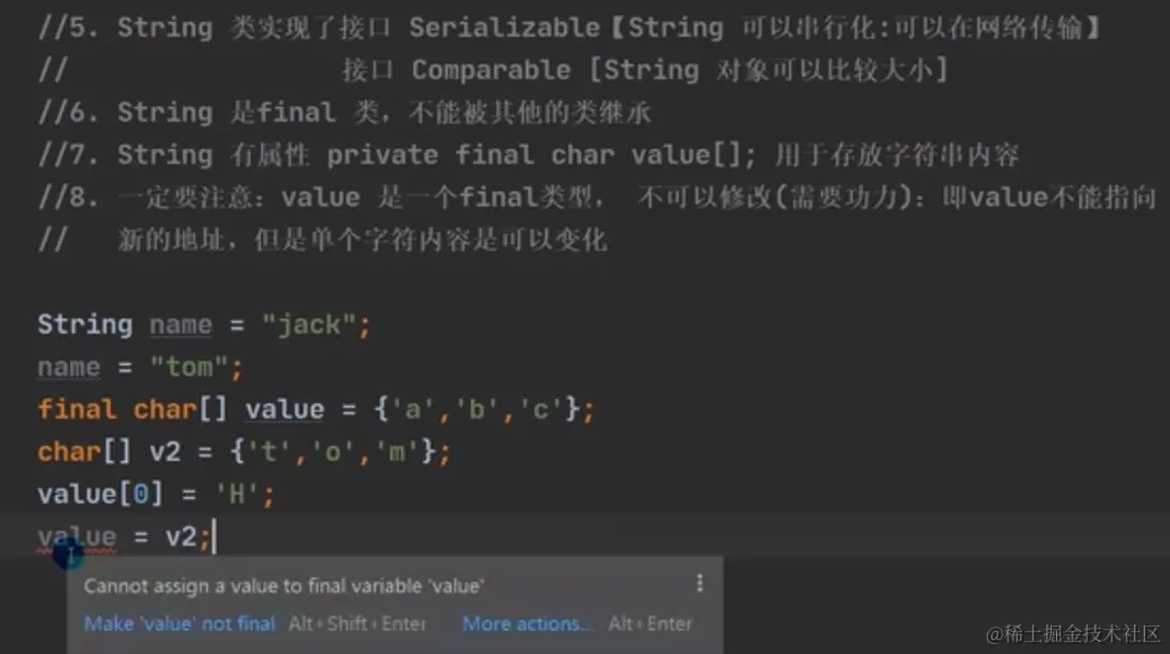 注意: value 是个final类型, 不可以修改: 即value不能指向新的地址,但是单个字符内容是可以变化