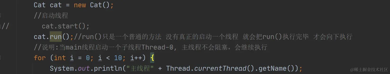 // cat.run();//run()只是一个普通的方法 没有真正的启动一个线程 就会把run()执行完毕 才会向下执行