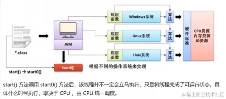 start0方法调用start0()方法后,该线程并不-定会立马执行,只是将线程变成了可运行状态。具体什么时候执行,取决于CPU,由CPU统一调度。
