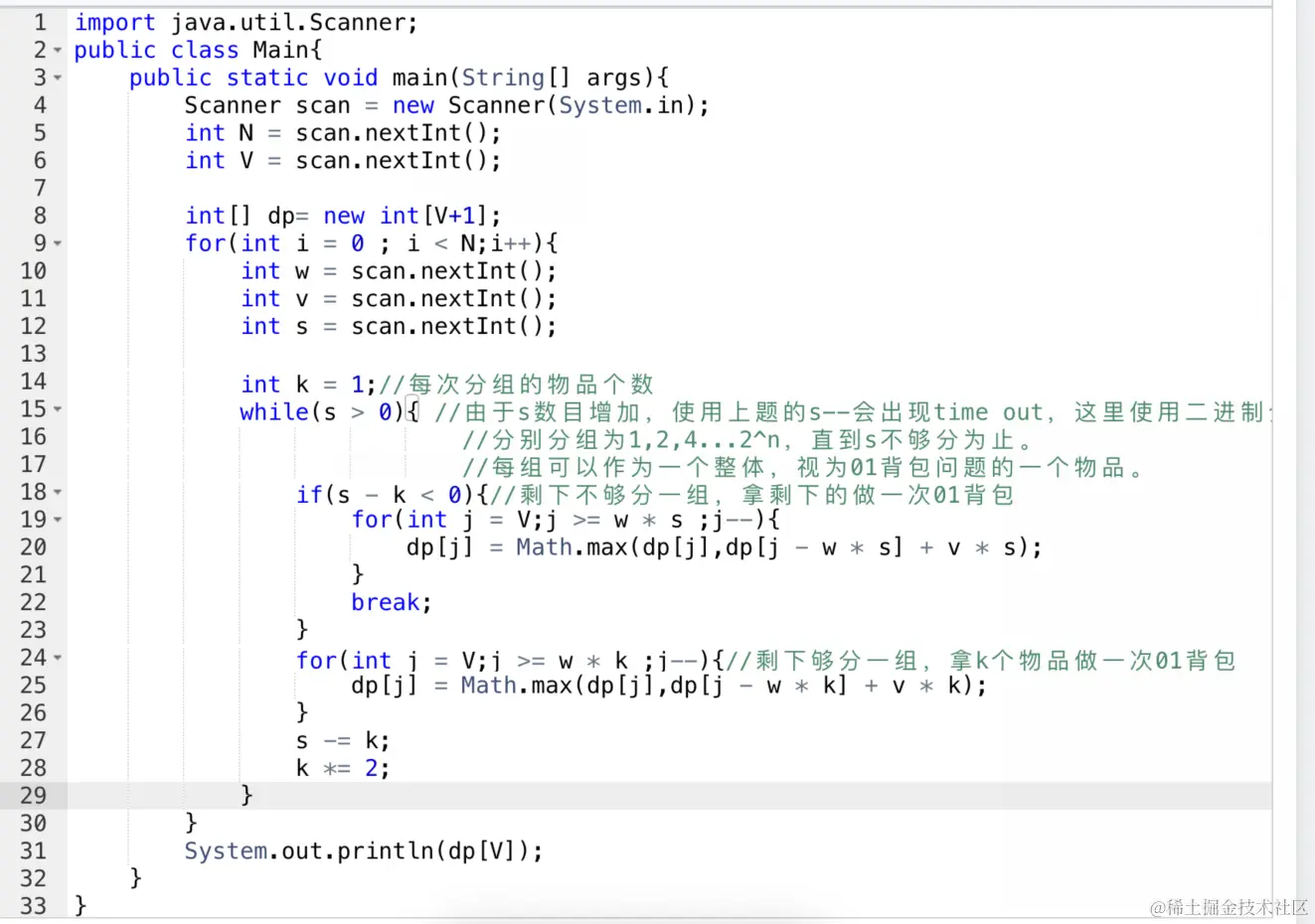 dp[i][i] = Math.max(dp[i][i], dp[i - 1][j - k * v[i]] + k * W[i]);//多重背包