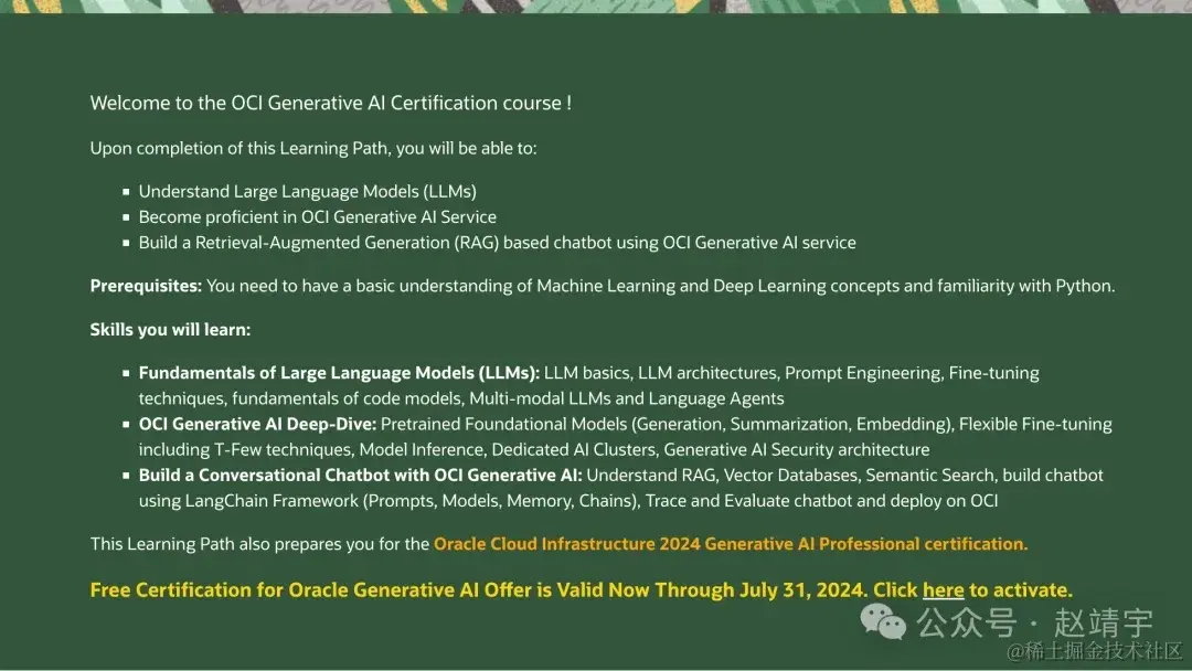 可以看到,目前免费政策正在执行,到今年的7月31号截止,有想法的小伙伴们要抓紧学习了。具体信息可参考OU官方的介绍:全新推出OCI Generative AI免费认证