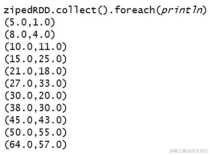 zip()功能,让我们来看一下输出,但一定要包括collect()或其他形式的操作,以确保数据按顺序呈现。如果我们不使用操作方法,RDD 的输出将是随机的: