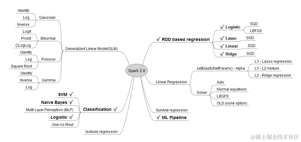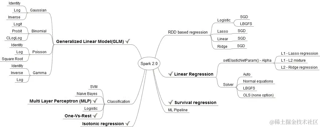尽管一些方法,比如LinearRegression() API,从理论上来说自 1.3x+版本就已经可用,但重要的是要注意,Spark 2.0 将它们全部整合到一个易于使用和可维护的 API 中(即向后兼容),以 glmnet R 的方式移动基于 RDD 的回归 API 到维护模式。L-BFGS 优化器和正规方程占据主导地位,而 SGD 在 RDD-based APIs 中可用以实现向后兼容。
