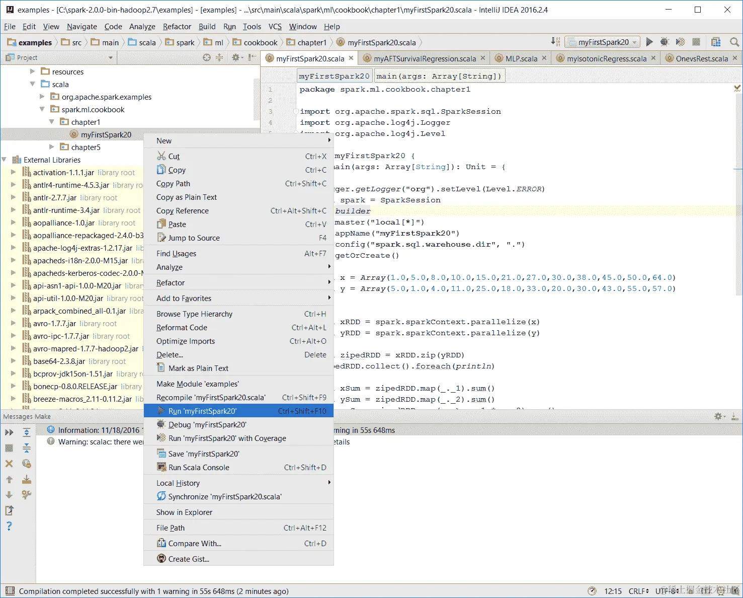 再次确保下载并探索来自 GitHub 的 Dataset 源文件,该文件约有 2500+行。探索 Spark 源代码是学习 Scala、Scala 注解以及 Spark 2.0 本身高级编程的最佳方式。