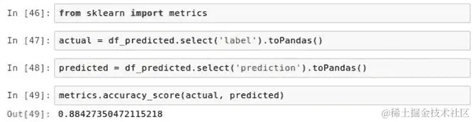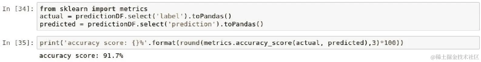 actual和predicted,并使用metrics.accuracy_score()函数计算了 91.7%的准确度分数,如下截图所示: